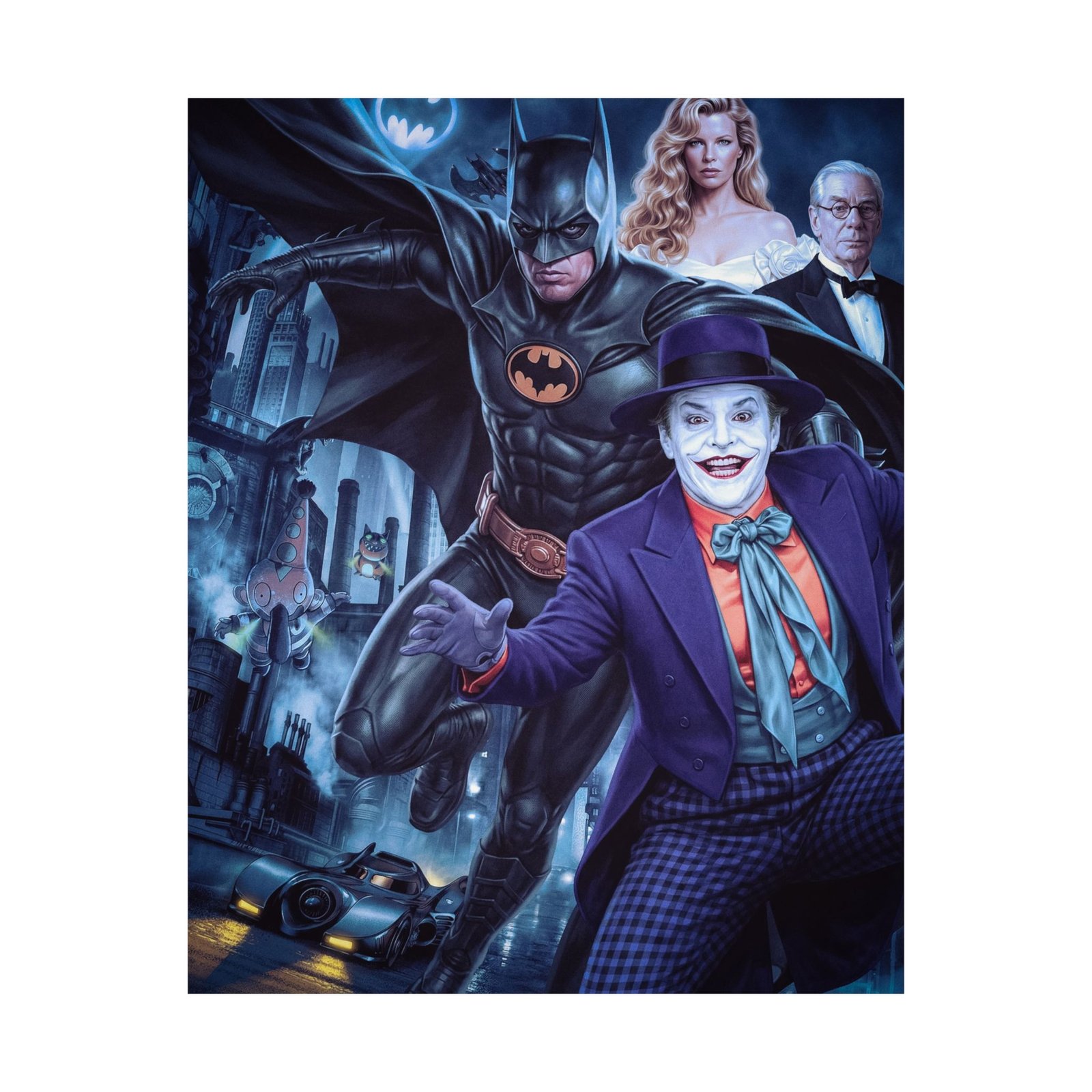 From the flowing cape and iconic emblem to the purple-suited madness front and center, this piece channels pure late-80s comic book movie nostalgia.