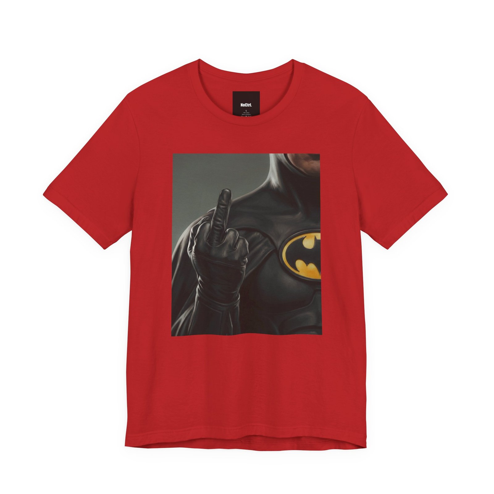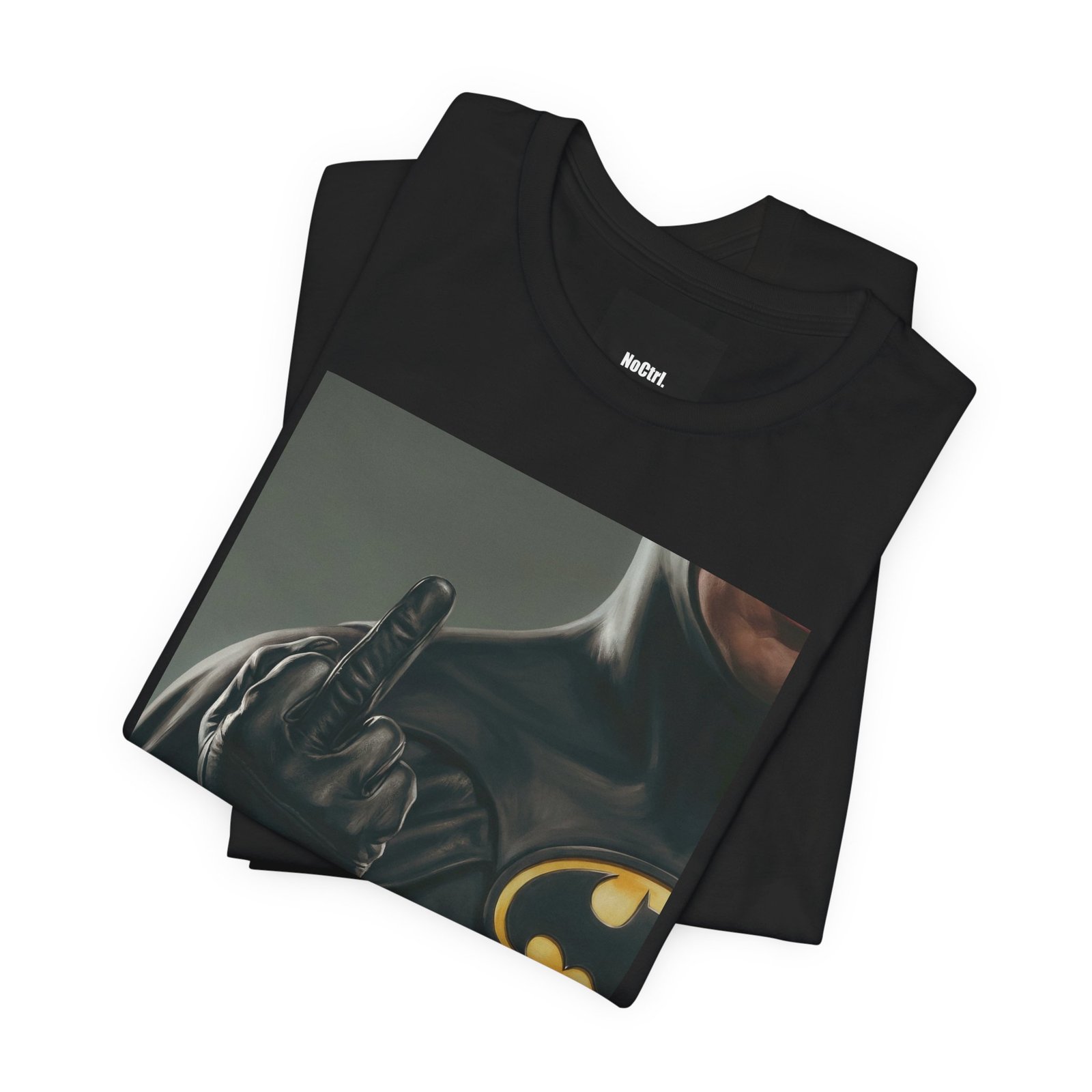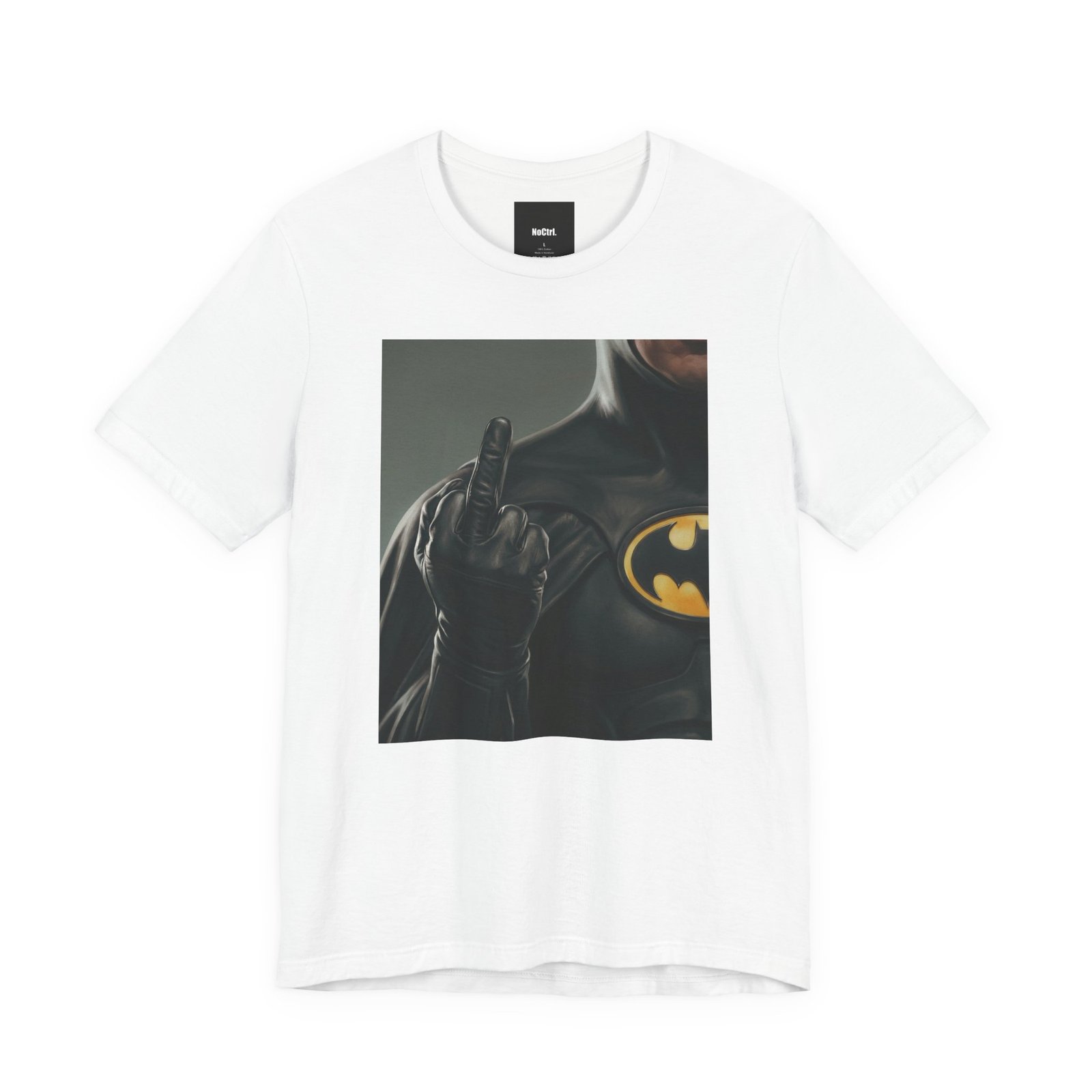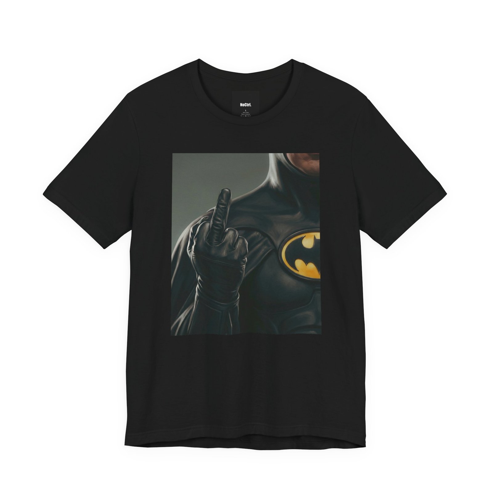 The “Zero Chill Vigilante” Tee from NoCtrl Collective takes a legendary dark hero and throws the rulebook out the window. Clad in the iconic black suit with the unmistakable chest emblem, the masked guardian delivers a gesture that says exactly what he’s thinking — loud and clear.