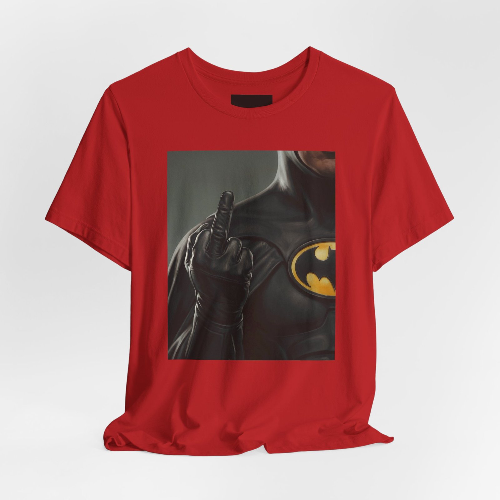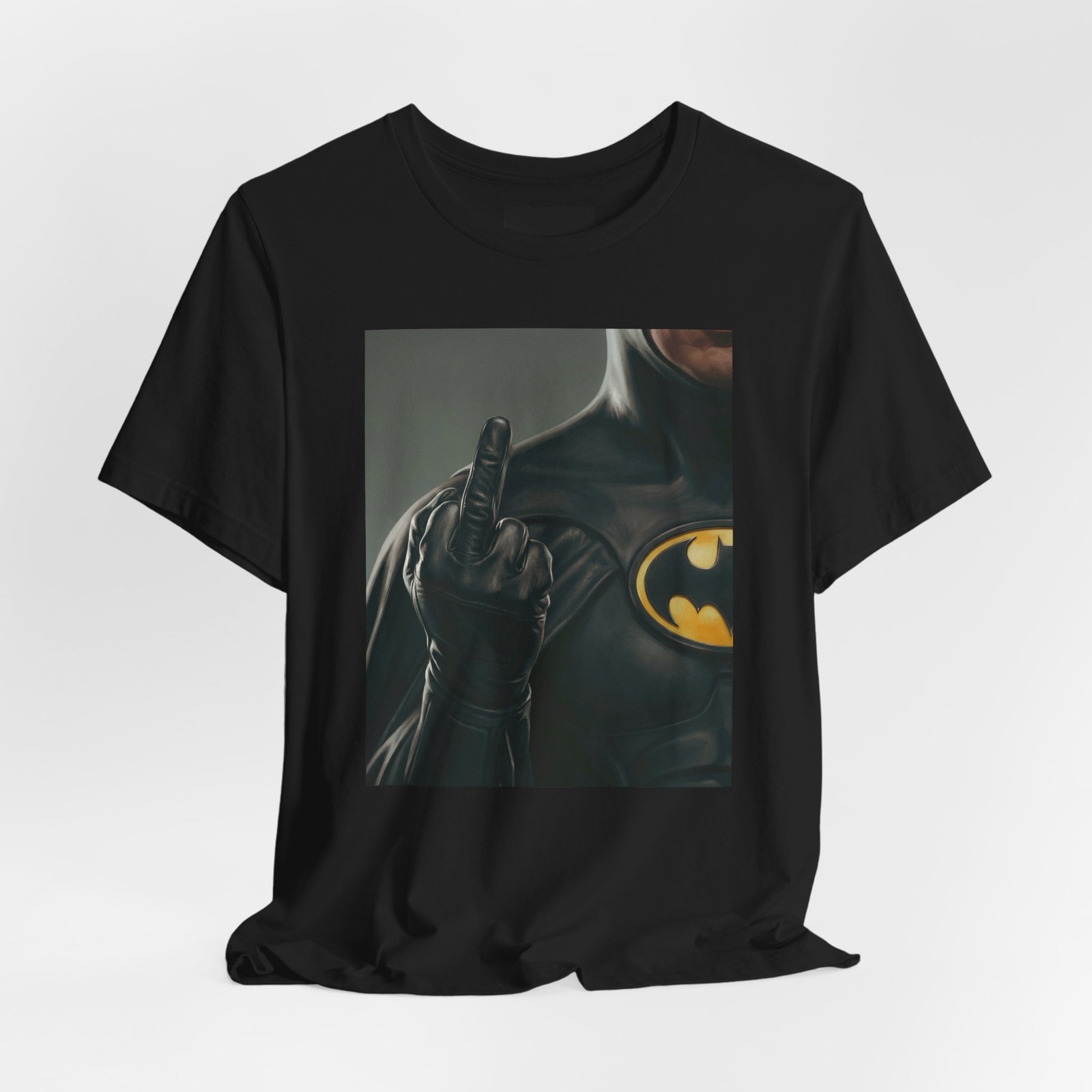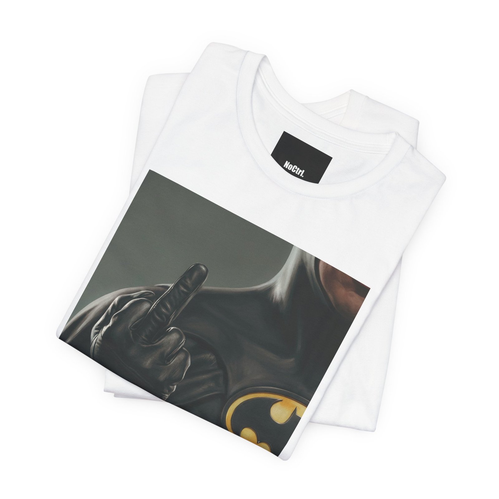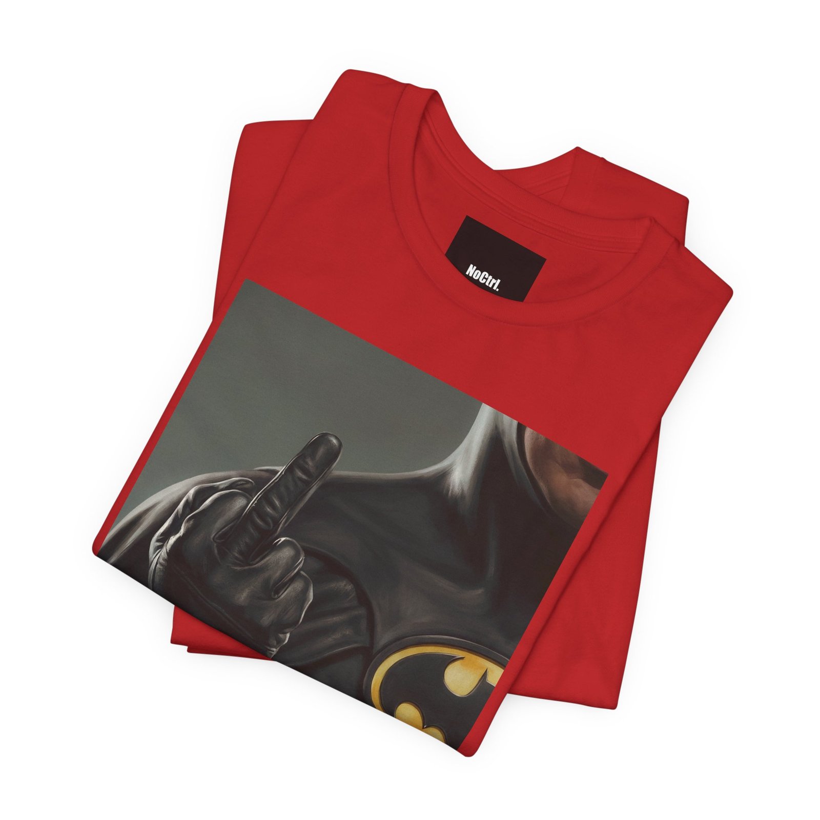 The “Zero Chill Vigilante” Tee from NoCtrl Collective takes a legendary dark hero and throws the rulebook out the window. Clad in the iconic black suit with the unmistakable chest emblem, the masked guardian delivers a gesture that says exactly what he’s thinking — loud and clear.
