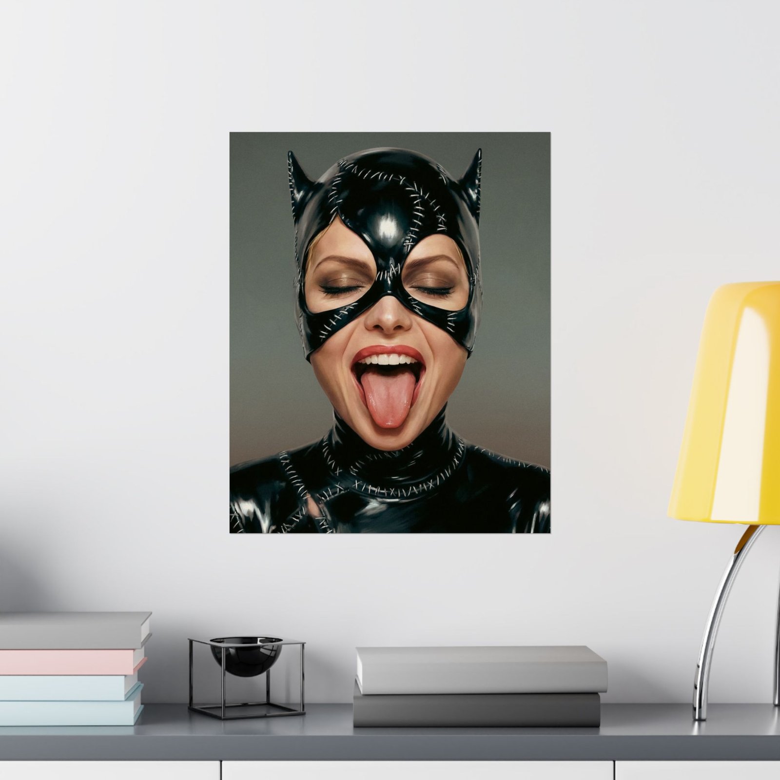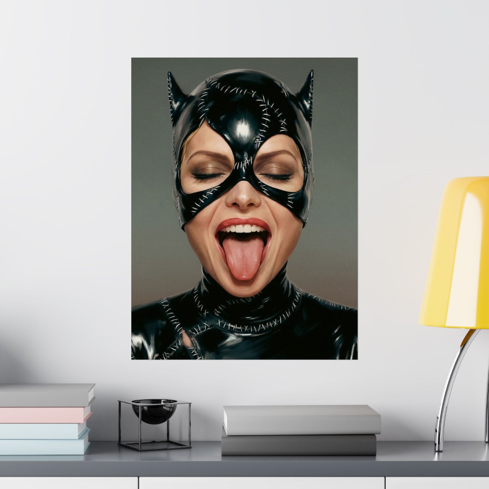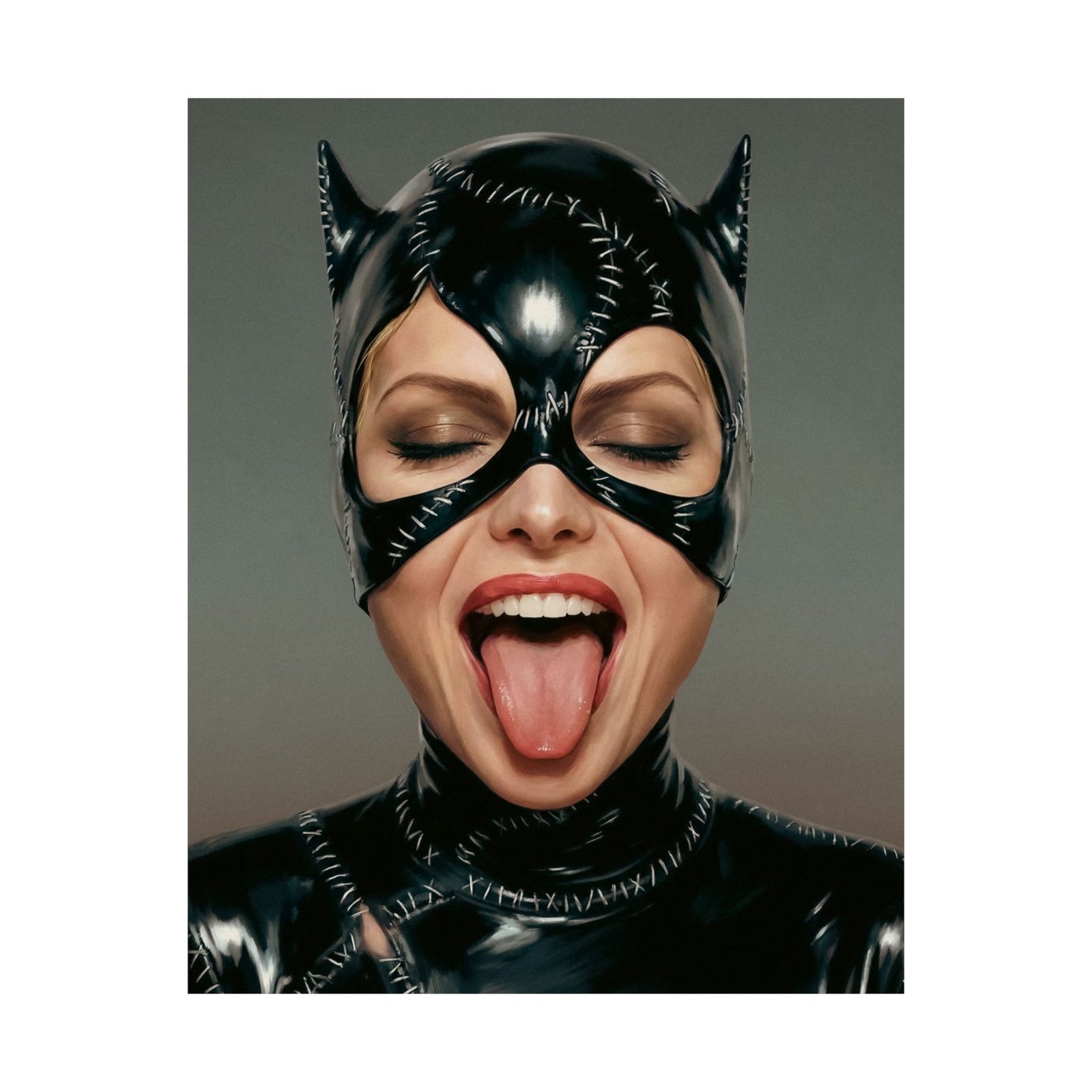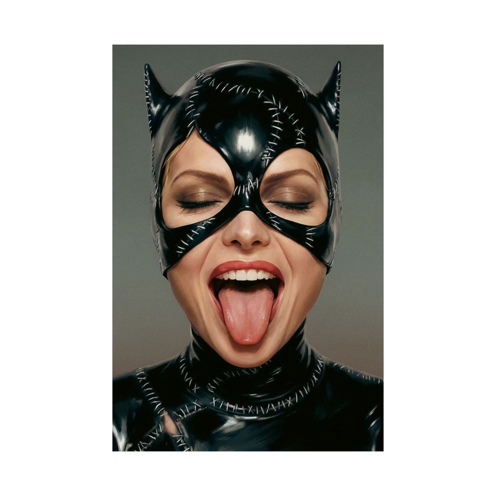 Eyes closed in carefree confidence, she sticks out her tongue in a moment of bold defiance — turning the image of a mysterious vigilante into something mischievous and human. The contrast between the dark, polished costume and the playful gesture creates a perfect balance of attitude and humor.