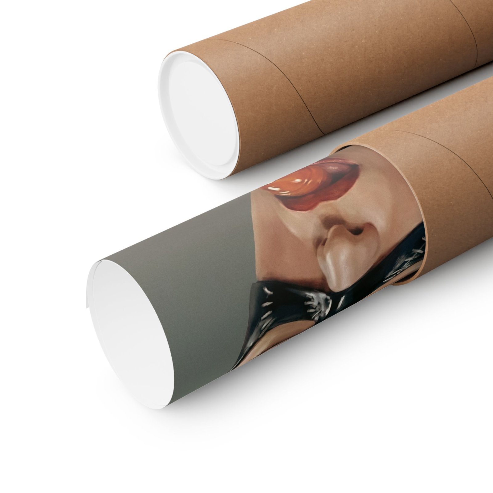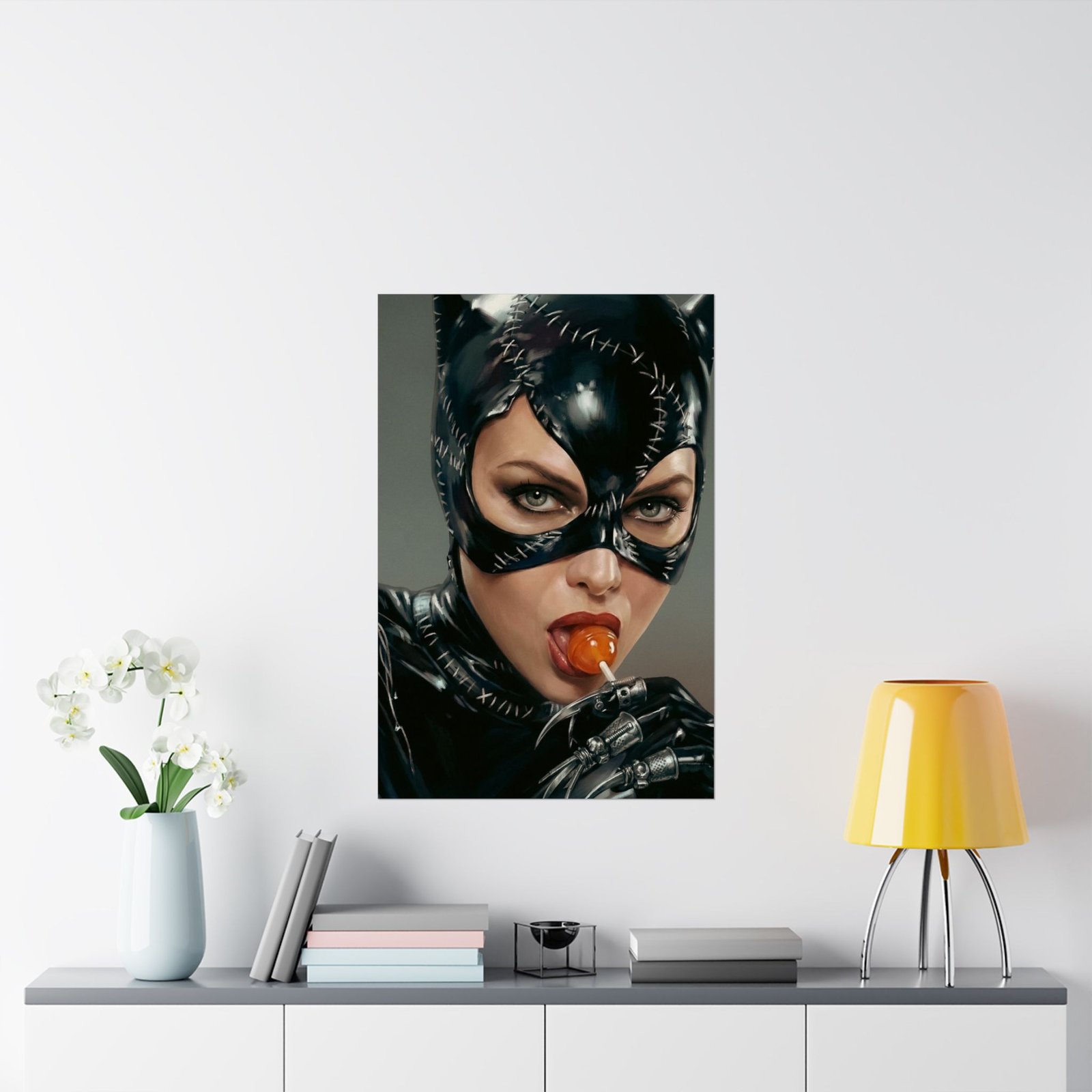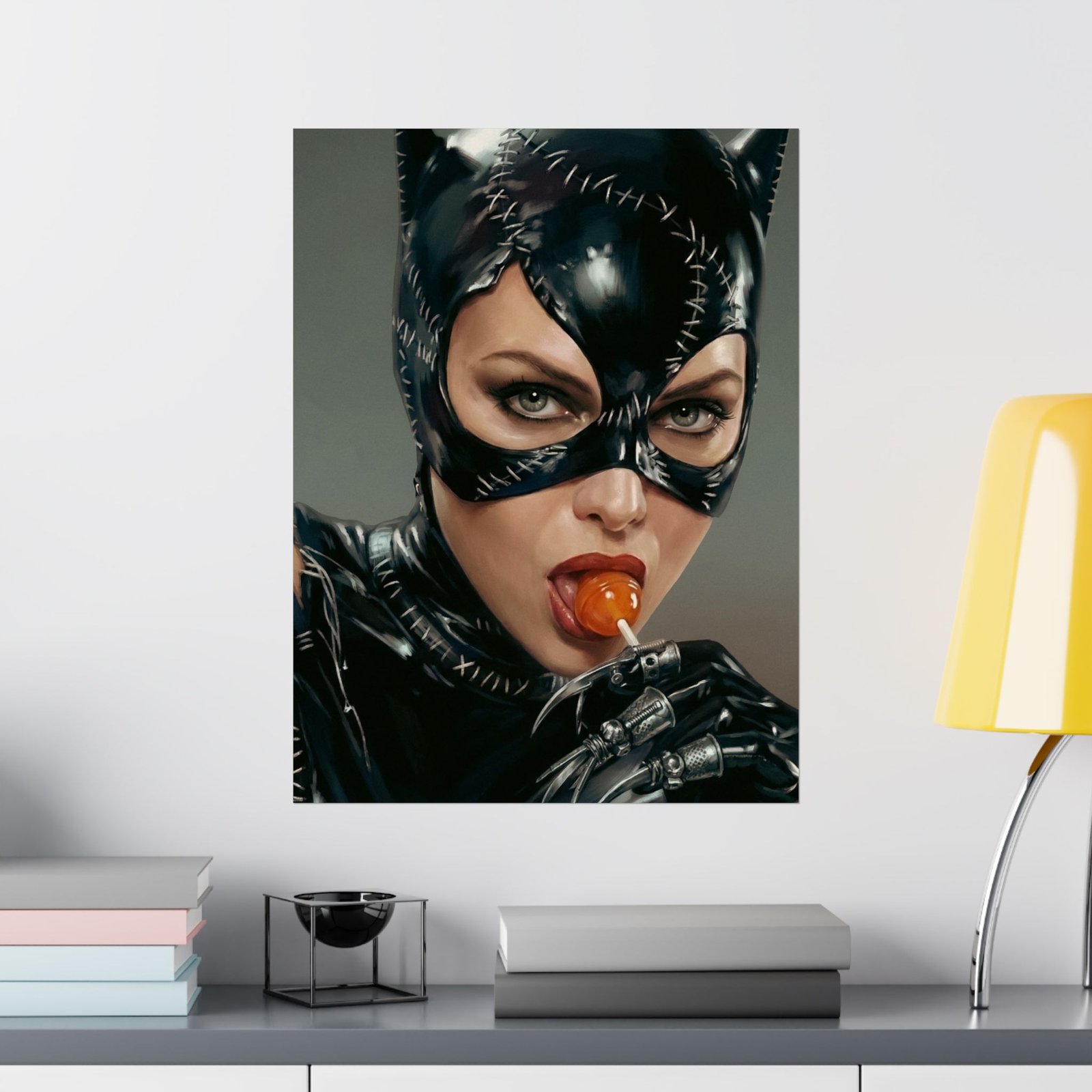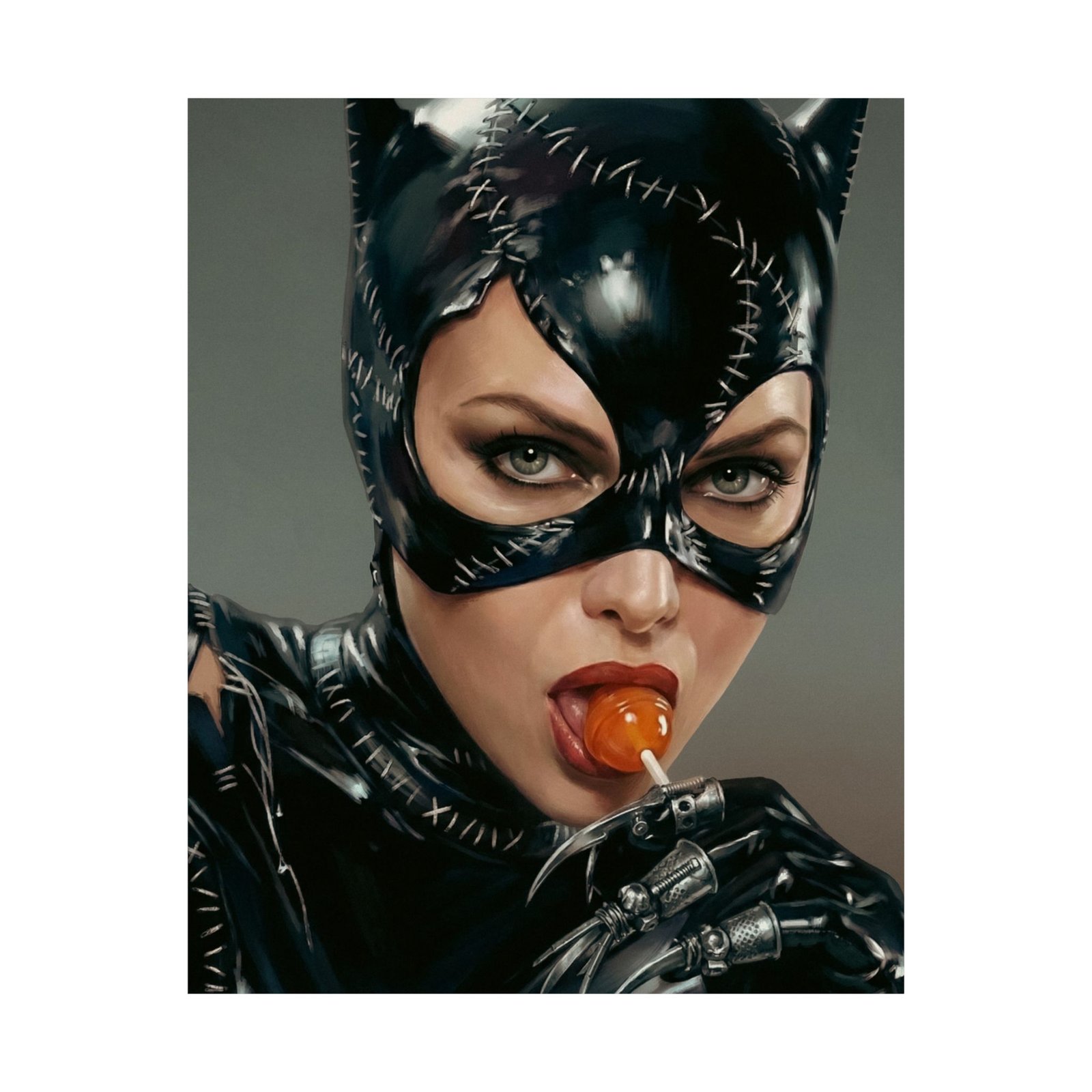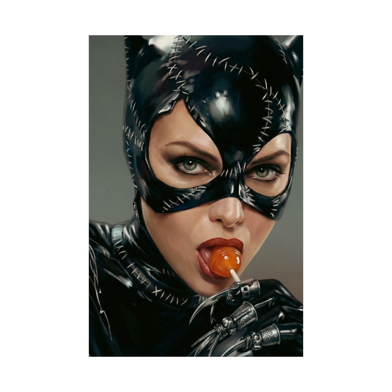 A striking blend of seduction and danger, “Sweet Temptation” captures the irresistible allure of a mysterious anti-heroine. Dressed in a sleek stitched leather suit and mask, she locks eyes with the viewer with a confident, almost playful intensity.