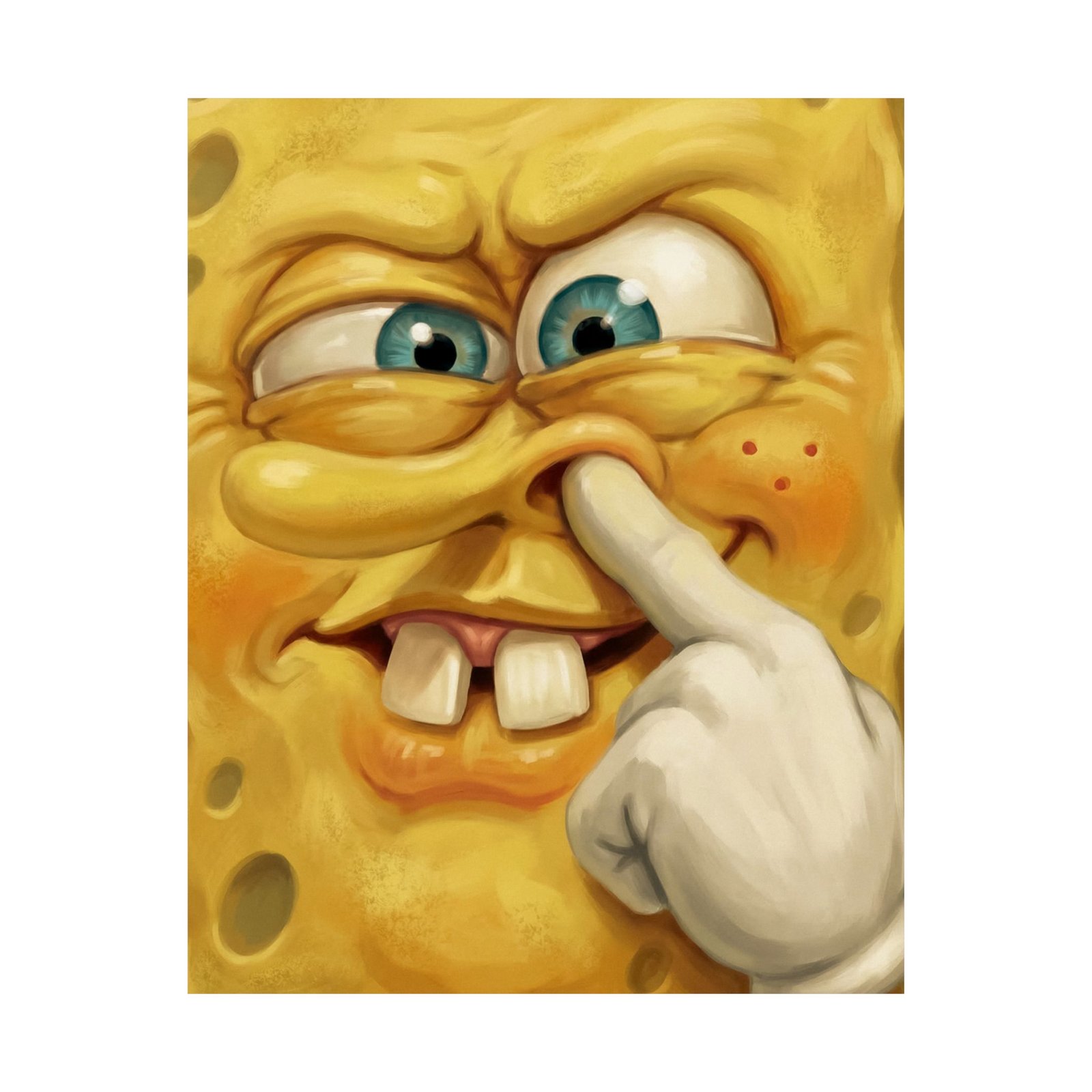 Crude, chaotic, and unapologetically disgusting, “Zero Manners” captures a hilariously uncomfortable moment of cartoon absurdity. The exaggerated sponge-like character stares ahead with sleepy, uneven eyes while a gloved finger digs unapologetically into one nostril — completely ignoring the concept of dignity.